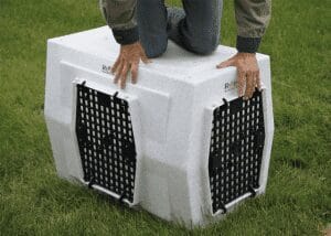 Most kennels are simply not strong enough to protect your dog in an impact situation. Ruff Land’s one-piece roto molded kennel construction is extremely strong. The walls, top and floor on Ruff Land Kennels also have built-in flexibility which absorbs energy that would otherwise be transferred to your dog. This is where the “stiff”, two-walled plastic kennels, which claim to be safer, fail. They may not break, but when your dog hits the side of the kennel, there is no give like there is with a Ruff Land. The raised floor in a Ruff Land also serves to provide both strength and cushion as does the designed-in body crease around the middle of the kennel. Likewise, the composite doors on a Ruff Land kennel are remarkably strong and designed to absorb energy. Plus, they feature six locking lugs where other kennels have no more than four. Then there are the all-important heavy-duty tie-downs which you should always use. If your kennel is connected to your truck it can take advantage of your truck absorbing impact energy. But only if the tie downs are designed properly. Ruff Land tie downs are designed like the driver retention devices on a race car.