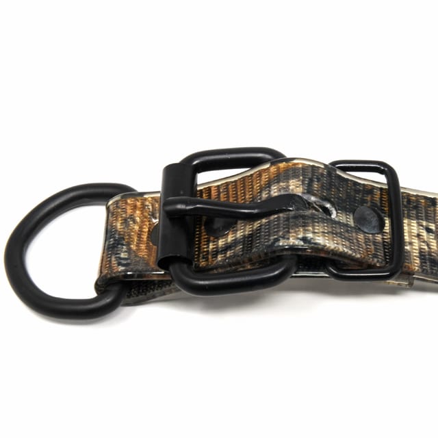 The 1 Inch Realtree Max 5 Camo D End Collar is made from SunGlo material that incorporates 2 ply high quality nylon polyurethane coated webbing. These collars are made of a durable waterproof non-porous material that does not absorb odors or stains and cleans up easily with soap and water. The in-line riveting design coupled with heavy duty flat black plated roller buckle, tuck loop and D Loop make this collar virtually indestructible. The 1 Inch Realtree Max 5 Camo D End Collar is Proudly Made in America and is constructed with the finest quality materials.