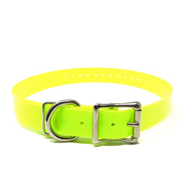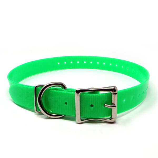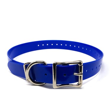 The 1" Universal Replacement Strap with Roller Double Buckle and D Loop is constructed with heavy duty rivets and nickel plated hardware. This collar will last for many seasons in the field.