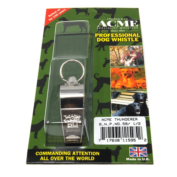 The Acme Thunderer 59.5 Whistle is nickel plated solid brass. A medium sized pea whistle with a high pitch and far reaching tone is popular among gun dog trainers, hunters and field trialers.