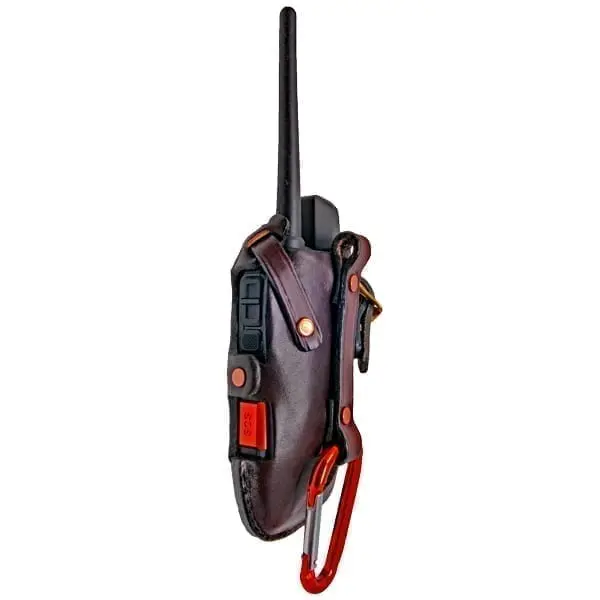 The Alpha 200/300 series Leather Holster is hand crafted in the USA from 8-10 oz. English Bridle Leather and is designed to work with the 200/300 series Garmin Alpha Transmitters. The Alpha 200i/300i Leather Holster is all about versatility with optional carabiner placement for carrying upside down or right-side up. Additionally, the all around carrier has a belt loop built into the unit allowing it to hang-right side up or upside down. All mounting loops are secured with solid copper double cap rivets. The unit is secured within the carrier with a 1/2″ leather strap and a heavy duty solid brass roller buckle. To sum it up, this is one versatile holster.