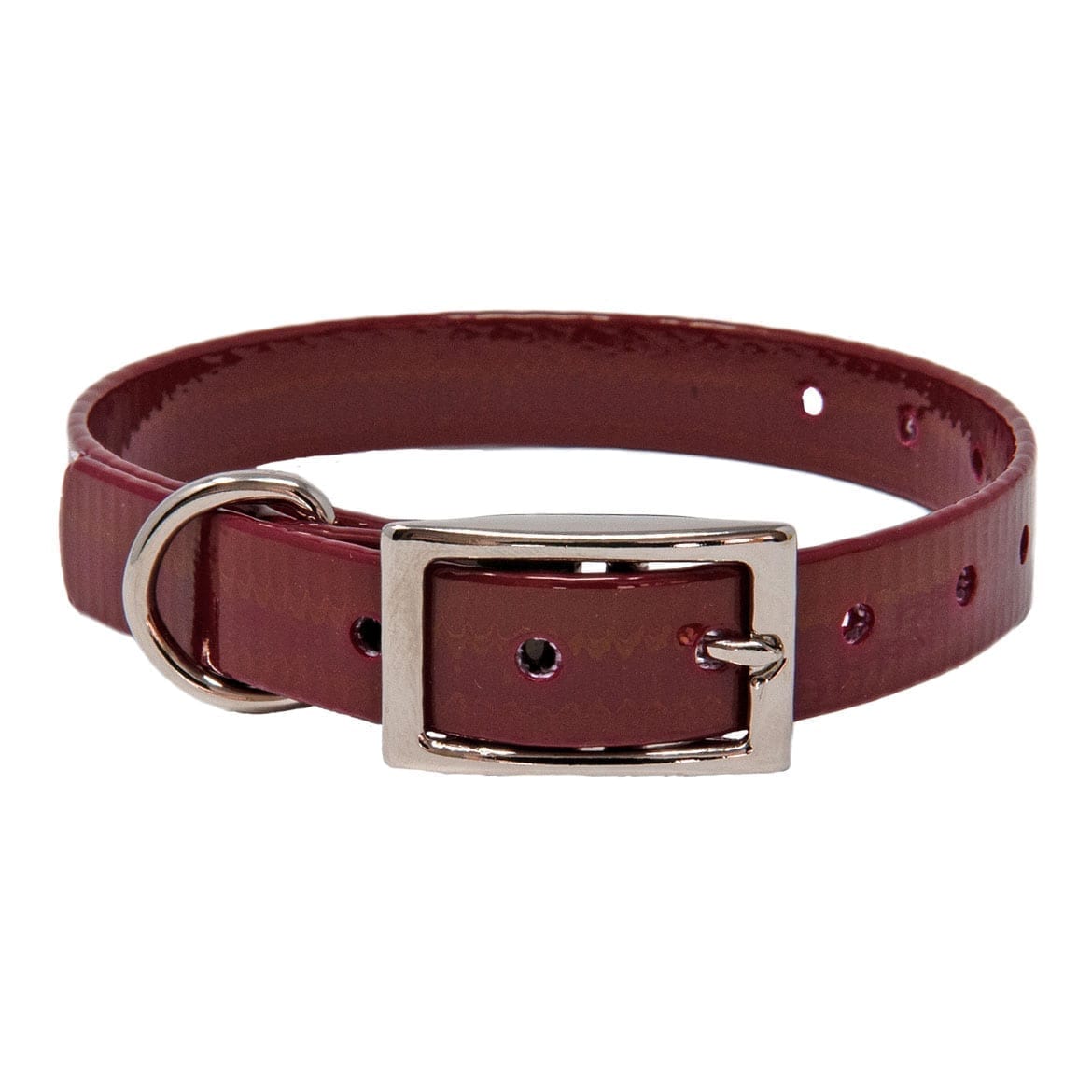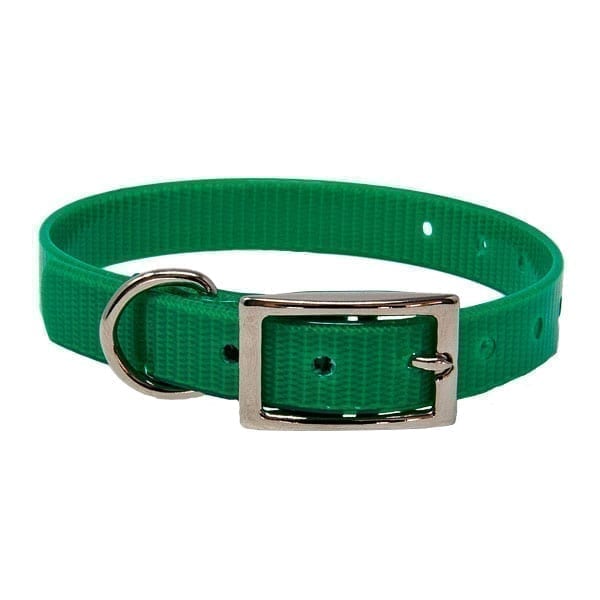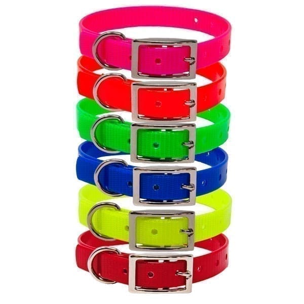 The Day Glow Puppy Collar has nickel plated hardware and is made with BioThane® coated polyester webbing. Buckle, small D ring and rivets are all nickel plated. The polyurethane coating makes the collar water-resistant, protects from abrasions and soil, provides a UV protection against fading and makes it easy to clean. You can simply wash with soap, rinse with water and wipe with a cloth. Made in the USA