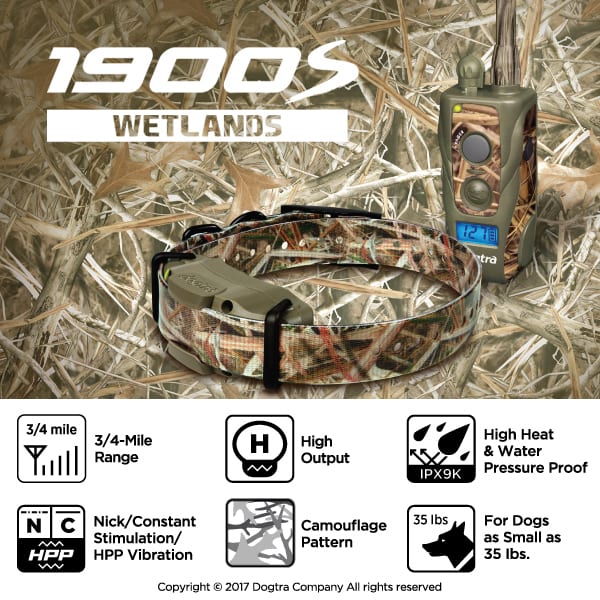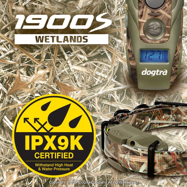 The Dogtra 1900S Wetlands System is designed for the wetland hunters in mind, offering 3/4-mile range with high output stimulation in 1-127 levels, coated in ideal camouflaged pattern for wetland hunting. The 1900S Wetlands’s receiver is IPX9K certified waterproof to withstand high heat and extreme water pressure, proving its durability and dependability for the most demanding conditions. This high output Dogtra 1900S Wetlands e-collar is the unit of choice for serious amateurs or award winning professional trainers and hunters. The 1900S Wetlands is 1-Dog system only. See the 1902S for a multi dog system.