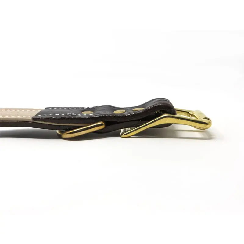 Dark Brown Latigo with Light Buffalo Liner Premium Deluxe Leather D Ring Collar is made with thicker more durable high quality leather grown in the Northern region of the USA. The leather has hand finished edges, and a non-oily English Bridle Leather finish for consistent color and pliability. Eight or more lock stitches per inch are used for proper leather stitching techniques (no cross-grain stitching) to maintain material strength and integrity of the leather. A skive leather craft cut is used on the flesh side of the leather to create a tapered thickness where leather pieces are joined to ensure a better finish, more pliable product, and a smooth transition where the collar contacts your dog's neck. The 1 Inch Dark Brown Latigo with Light Buffalo Liner Premium Deluxe Leather D Ring Collar is an American made product and uses the finest quality solid brass hardware.