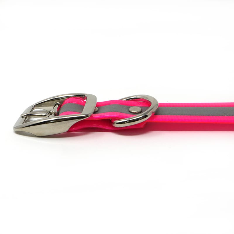 The 1 Inch Reflective Pink Center Ring Collar is made with BioThane® coated webbing and a 3M® reflective strip that runs the entire length of the collar. The 3M® reflective strip features Edgeguard technology that protects the edges of the 3M® reflective strip from abrasion and produces stronger adhesion to the webbing. It reflects the available light to increase visibility and safety for your dog in low light conditions. These collars are made of a durable waterproof non-porous material that does not absorb odors or stains and cleans up easily with soap and water. The in-line riveting design coupled with the solid nickel plated steel hardware make this collar virtually indestructible.