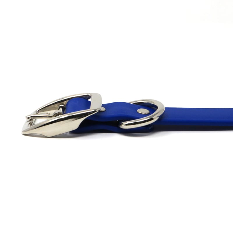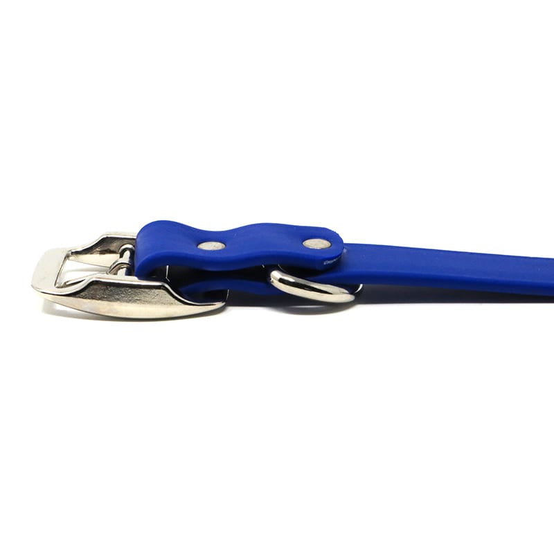 The K-9 Komfort 1 Inch TufFlex Blue Center Ring Collar has the feel of soft leather with the added benefits of being waterproof, odor resistant and cleans up easily with a damp sponge. The PVC coating over the high strength nylon webbing core allows this collar to remain soft and flexible down to -20 degree temps. The in-line riveting design coupled with the solid nickel plated steel hardware make this collar virtually indestructible.