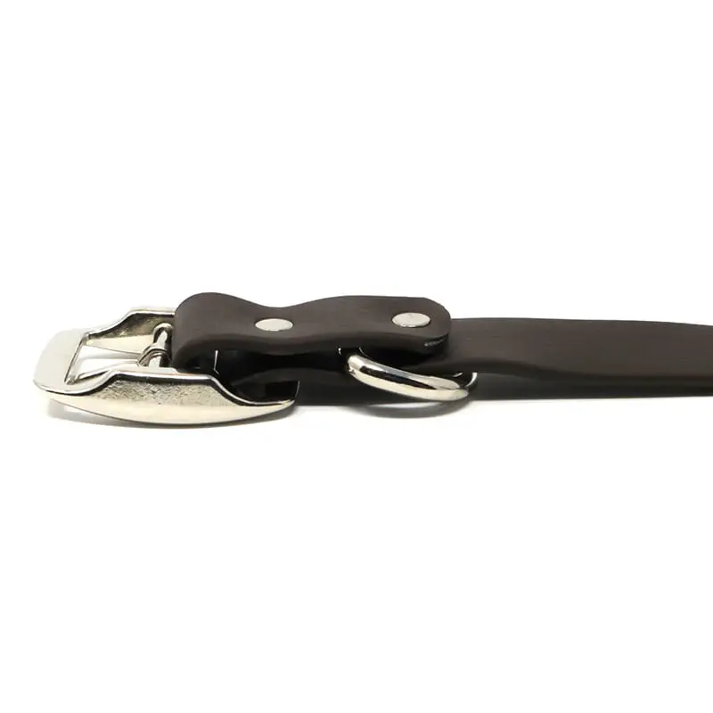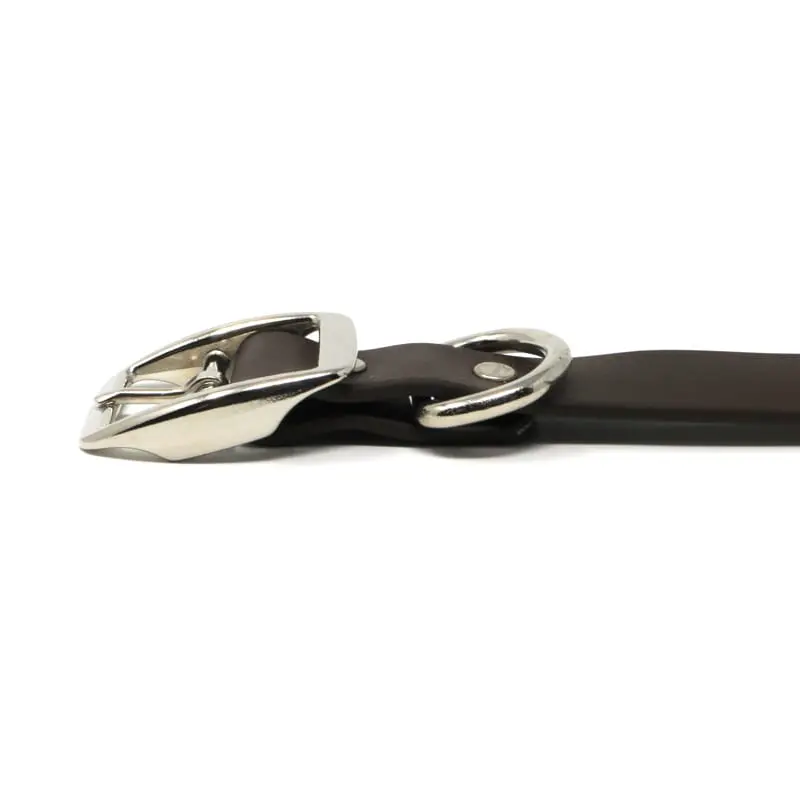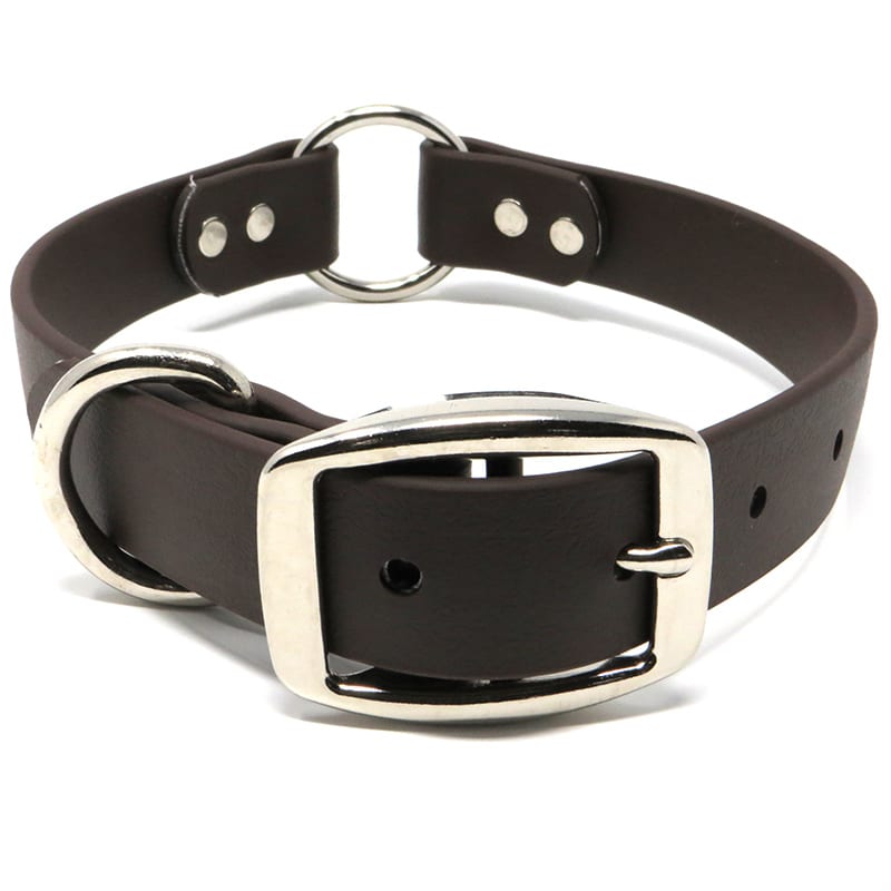 The K-9 Komfort 1 Inch TufFlex Brown Center Ring Collar has the feel of soft leather with the added benefits of being waterproof, odor resistant and cleans up easily with a damp sponge. The PVC coating over the high strength nylon webbing core allows this collar to remain soft and flexible down to -20 degree temps. The in-line riveting design coupled with the solid nickel plated steel hardware make this collar virtually indestructible.