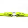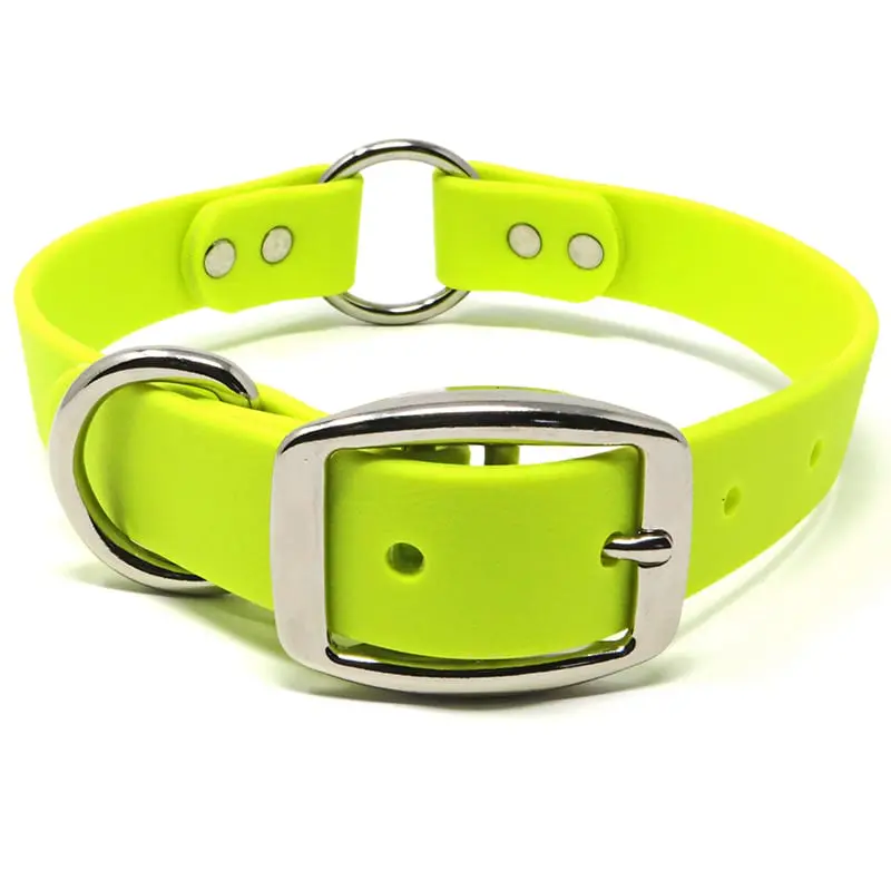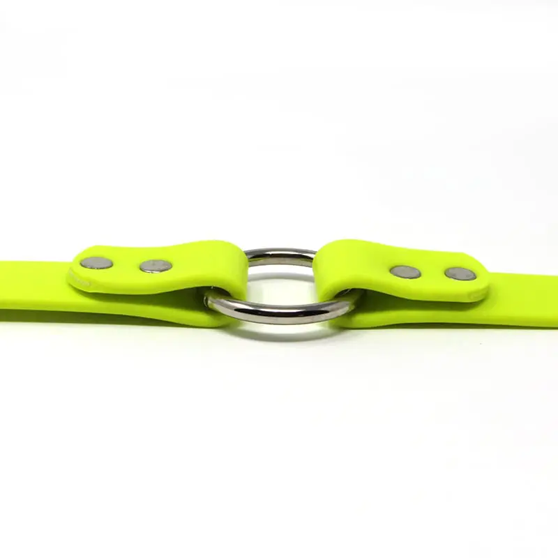 The K-9 Komfort 1 Inch TufFlex Neon Yellow Center Ring Collar has the feel of soft leather with the added benefits of being waterproof, odor resistant and cleans up easily with a damp sponge. The PVC coating over the high strength nylon webbing core allows this collar to remain soft and flexible down to -20 degree temps. The in-line riveting design coupled with the solid nickel plated steel hardware make this collar virtually indestructible.