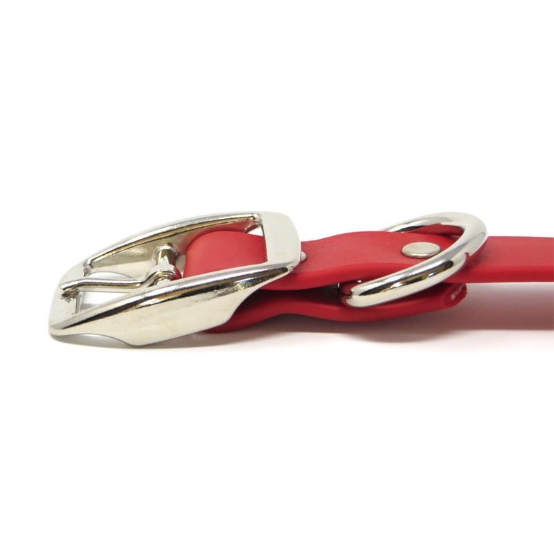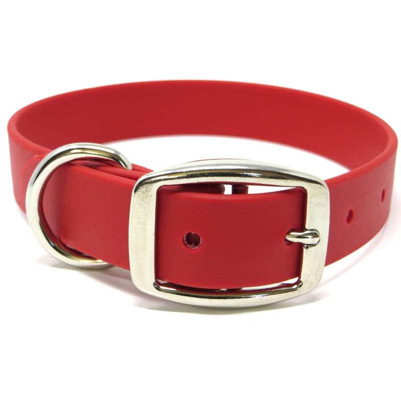 The K-9 Komfort 1 Inch TufFlex Red D Ring Collar has the feel of soft leather with the added benefits of being waterproof, odor resistant and cleans up easily with a damp sponge. The PVC coating over the high strength nylon webbing core allows this collar to remain soft and flexible down to -20 degree temps. The in-line riveting design coupled with the solid nickel plated steel hardware make this collar virtually indestructible.