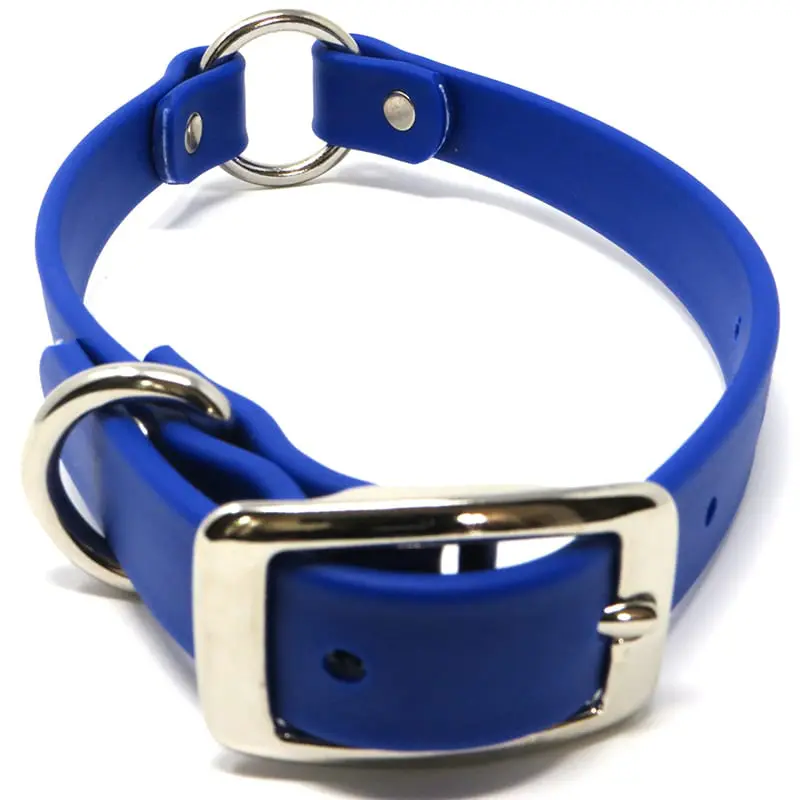 The K-9 Komfort 3/4 Inch TufFlex Blue Center Ring Collar has the feel of soft leather with the added benefits of being waterproof, odor resistant and cleans up easily with a damp sponge. The PVC coating over the high strength nylon webbing core allows this collar to remain soft and flexible down to -20 degree temps. The in-line riveting design coupled with the solid nickel plated steel hardware make this collar virtually indestructible.