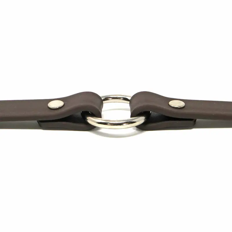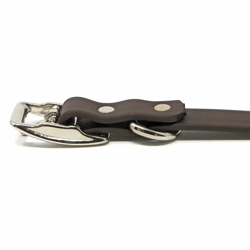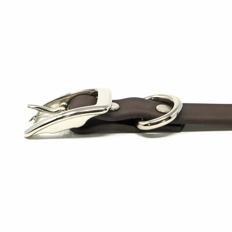 The K-9 Komfort 3/4 Inch TufFlex Brown Center Ring Collar has the feel of soft leather with the added benefits of being waterproof, odor resistant and cleans up easily with a damp sponge. The PVC coating over the high strength nylon webbing core allows this collar to remain soft and flexible down to -20 degree temps. The in-line riveting design coupled with the solid nickel plated steel hardware make this collar virtually indestructible.