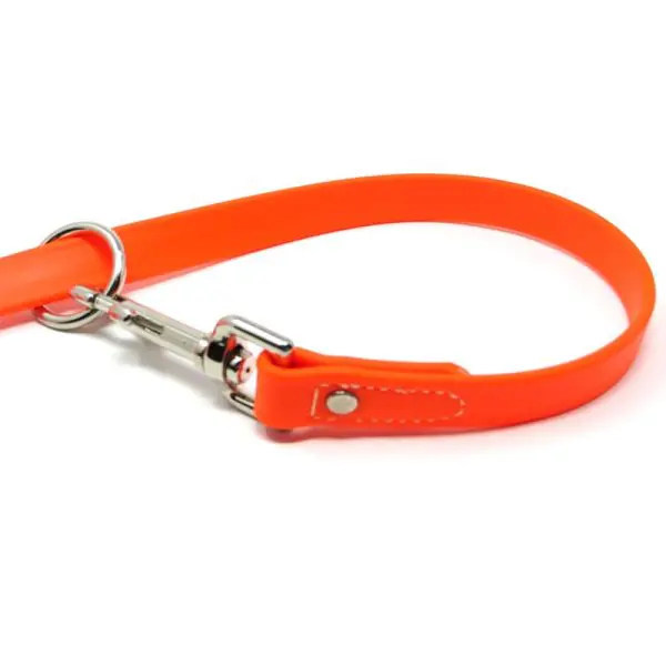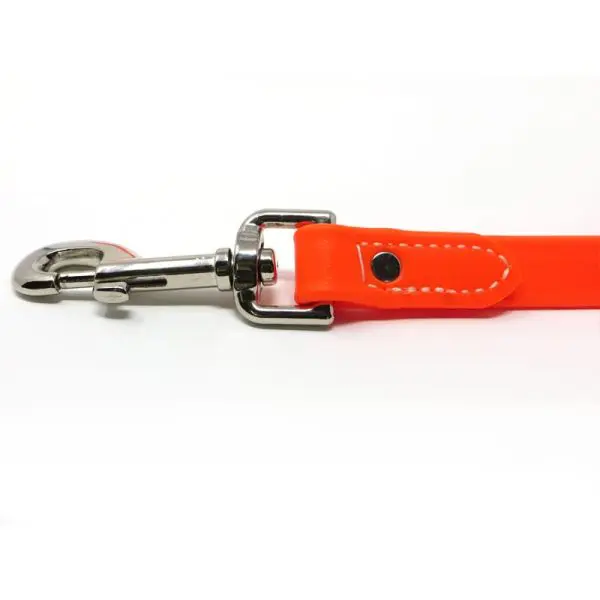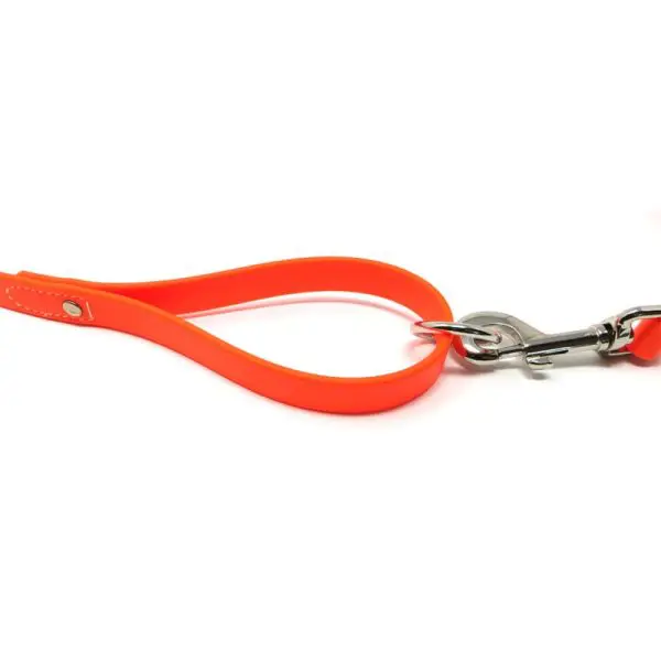 The K-9 Komfort TufFlex Neon Yellow Lead 3/4 in. by 4.5 ft and 6 ft have the feel of soft leather with the added benefits of being waterproof, odor resistant and clean up easily with a damp sponge. The PVC coating over the high strength nylon webbing core allows these leads to remain soft and flexible down to -20 degree temps. The in-line riveting design coupled with the solid nickel plated steel hardware make this lead virtually indestructible.
