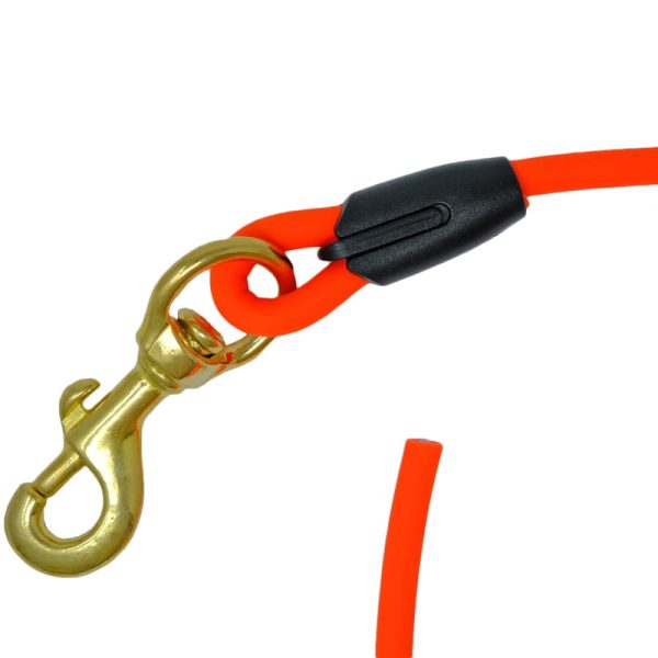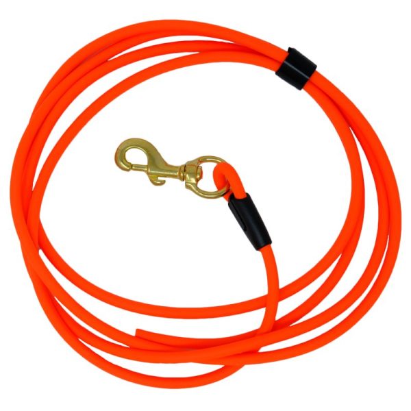 The Orange Round Check Cord 10 ft is made with BioThane, a PVC coated nylon rope, has a 3/8" diameter and uses solid brass hardware. This check cord has the feel of soft leather with the added benefits of being waterproof, odor resistant and cleans up easily with a damp sponge. The PVC coating over the high strength nylon core allows these check cords to remain soft and flexible down to -20 degree temps.