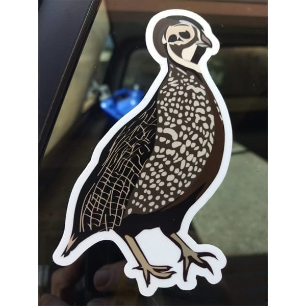 Our Mearns Quail sticker is a fun way to express your lifestyle. This is an artistic hand drawn rendering of the Mearns Quail. This sticker measures 3" wide and 5" tall and has a UV laminate to prevent fading and is also waterproof. The Mearns Quail Sticker has proven to not fade for three years plus in the Arizona sun.