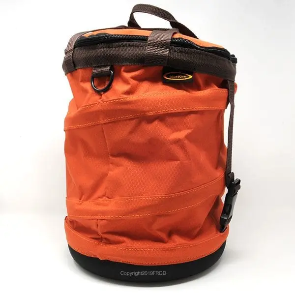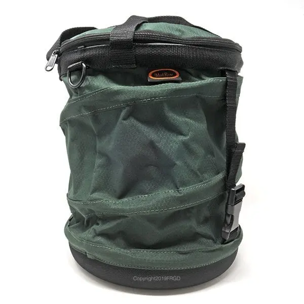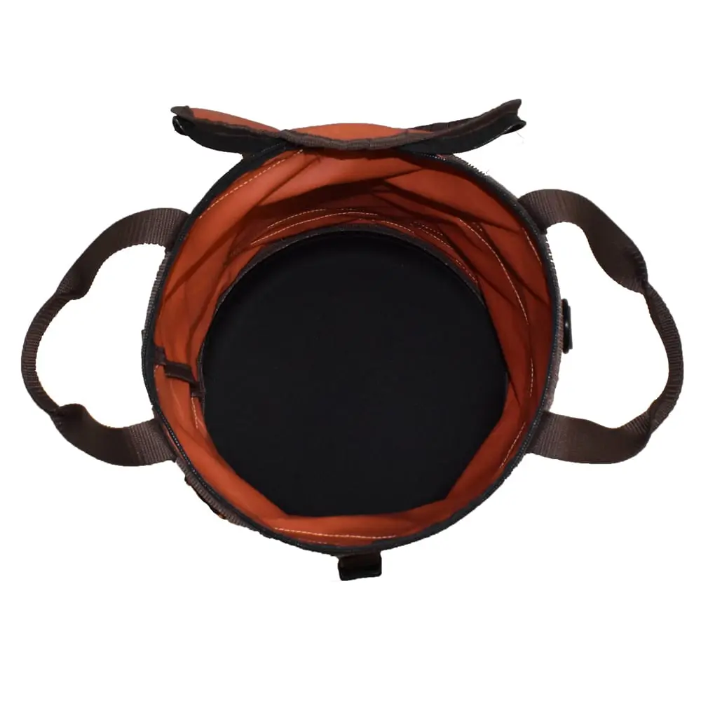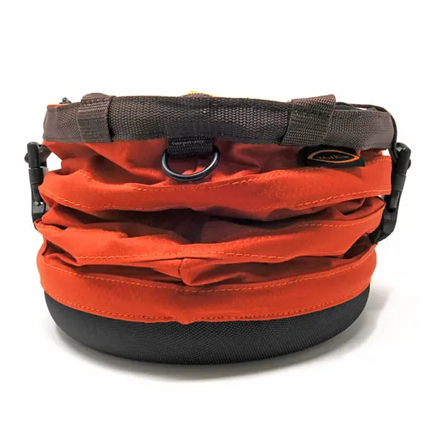 The Mud River Feed and Retrieve Collapsible Food Bucket holds approximately 30 cups (12 pounds) of dry dog food and is constructed of ripstop nylon with PVC backing. Coil construction helps maintain structure when open and closed.